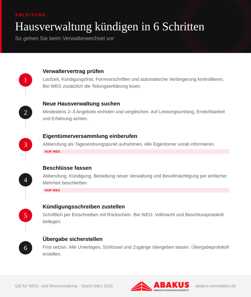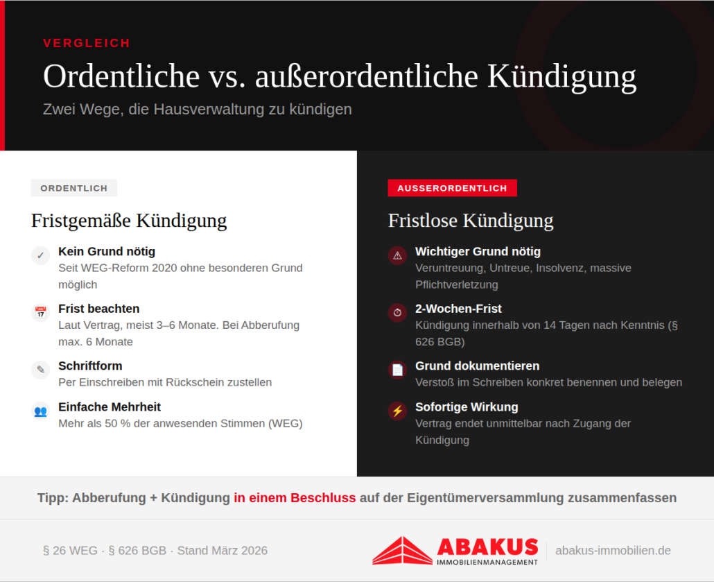 Seit dem 1. Dezember 2020 kann eine WEG-Verwaltung jederzeit durch einfachen Mehrheitsbeschluss abberufen werden (§ 26 Abs. 3 WEG). Ein wichtiger Grund ist nicht erforderlich. Der Verwaltervertrag endet nach der Abberufung automatisch spätestens nach sechs Monaten. Bei schweren Pflichtverletzungen ist auch eine fristlose Kündigung nach § 626 BGB möglich. Bei der Mietverwaltung gelten die Fristen aus dem Verwaltervertrag, in der Regel drei bis sechs Monate. Die Kündigung muss in beiden Fällen schriftlich erfolgen.