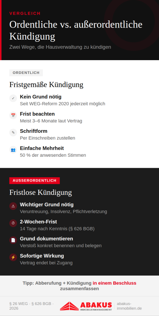 Allerdings gelten je nach Verwaltungsart unterschiedliche Regeln. Bei der WEG-Verwaltung sind Abberufung und Vertragskündigung zwei getrennte Rechtsakte. Bei der Mietverwaltung zählt allein der Verwaltervertrag. Wer hier Fehler macht, riskiert unnötige Kosten oder eine unwirksame Kündigung.